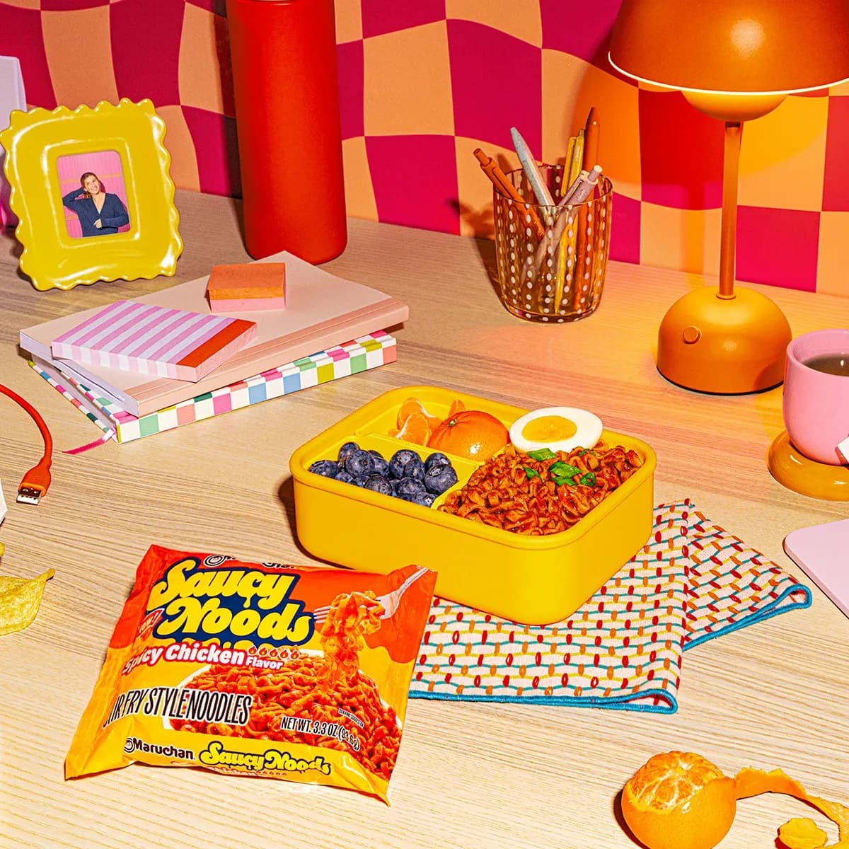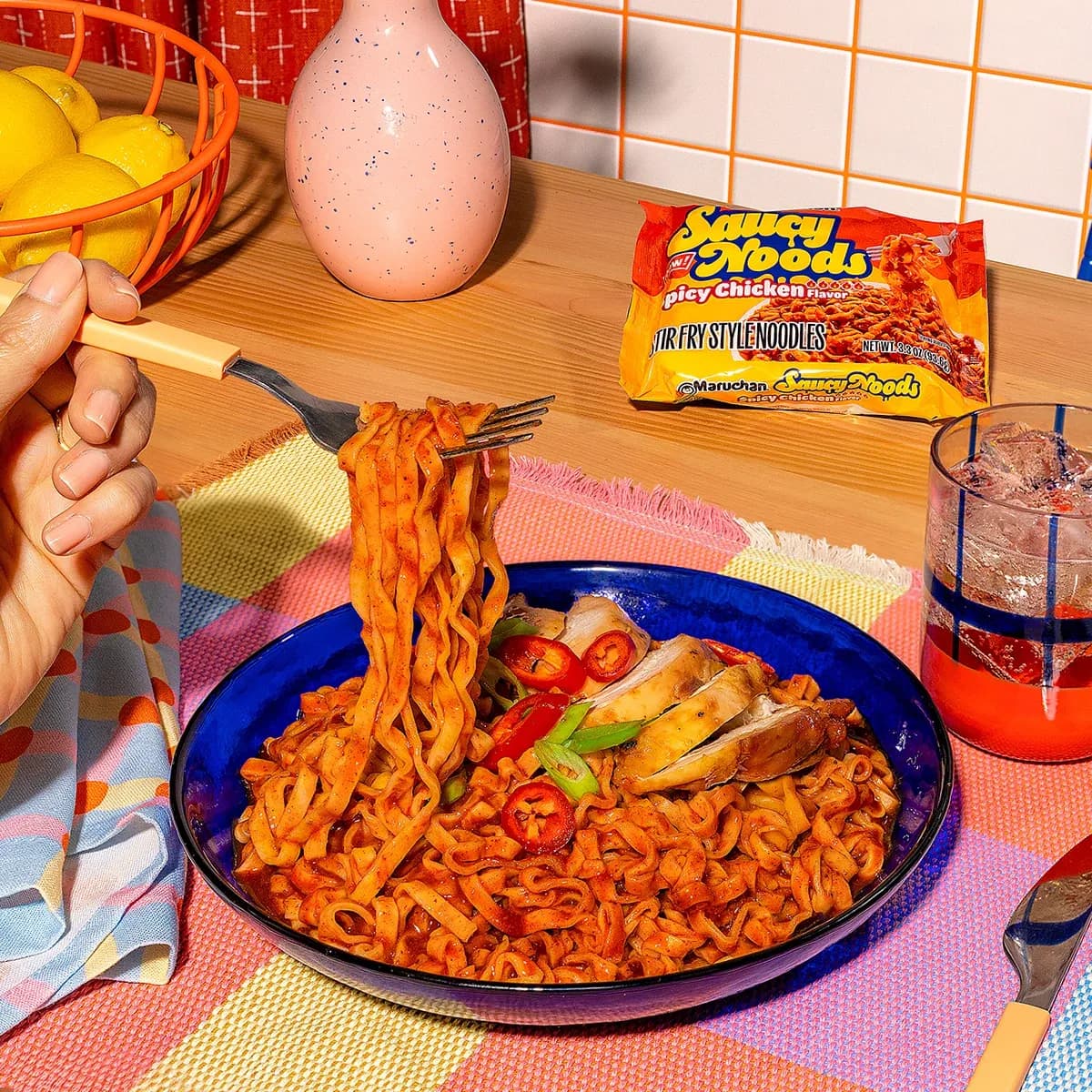 Savor the bold flavors of Maruchan Saucy Noods Spicy Chicken flavor—wide stir-fry style noodles coated in a rich, spicy sauce with a perfect kick of chili and habanero heat.