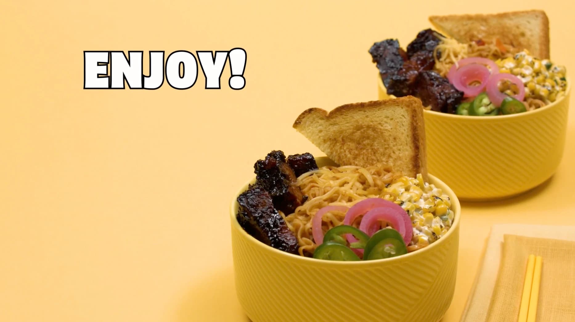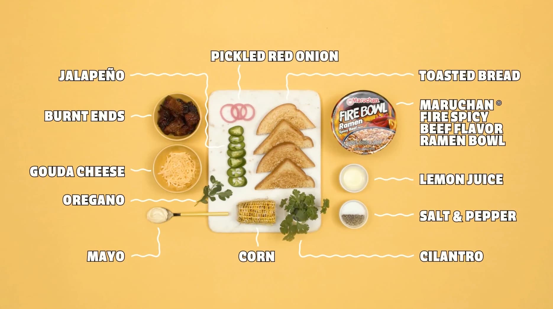 When burnt ends and corn salad meet Maruchan Fire Spicy Beef Bowl, tastebuds meet their new obsession. Jalapeño and pickled red onion pack just enough zip, and toasted white bread helps you soak up every last drop.