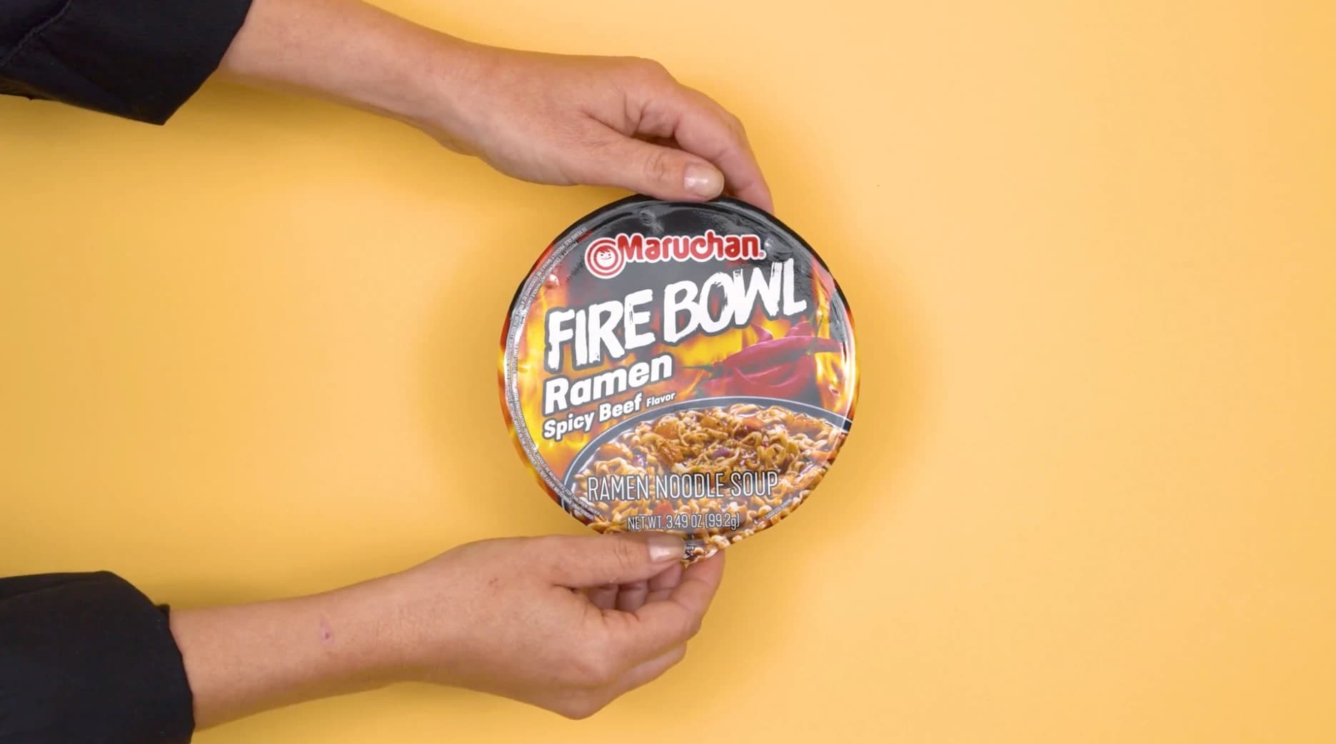 Remove the lids of the Maruchan Fire Spicy Beef Flavor Ramen Bowl packages and both packets from each. Pour packet #1 and packet #2 to each and fill water to the line indicated. Microwave uncovered on high for 3 minutes. Stir to combine.
