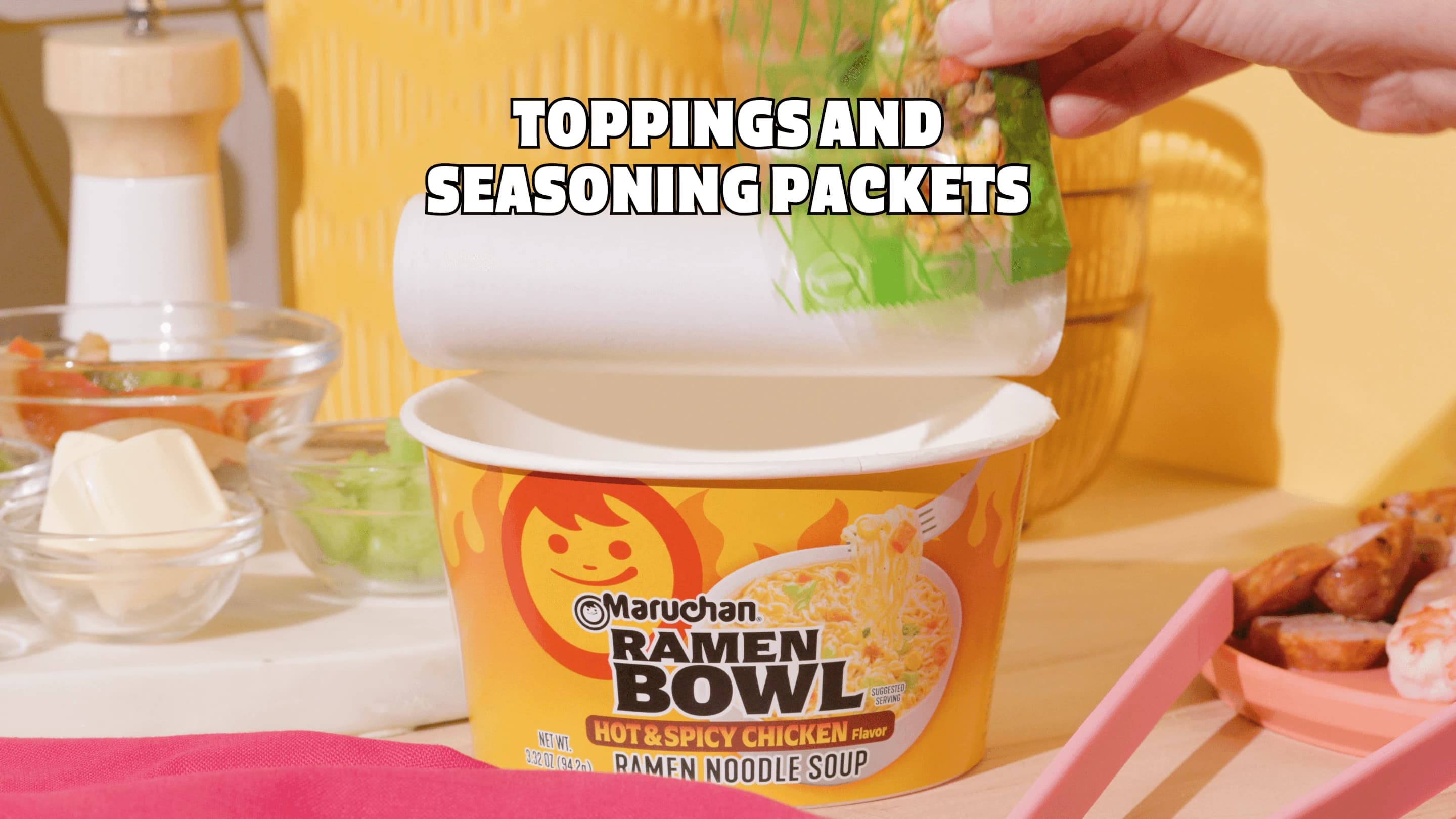 Remove the lids of the Maruchan Hot & Spicy Chicken Flavor Ramen packages and both packets from each. Add packet #1 to each and fill water to the line indicated. Microwave uncovered on high for 3 minutes. Let cool for 1 minute before adding packet #2. Stir until fully combined.