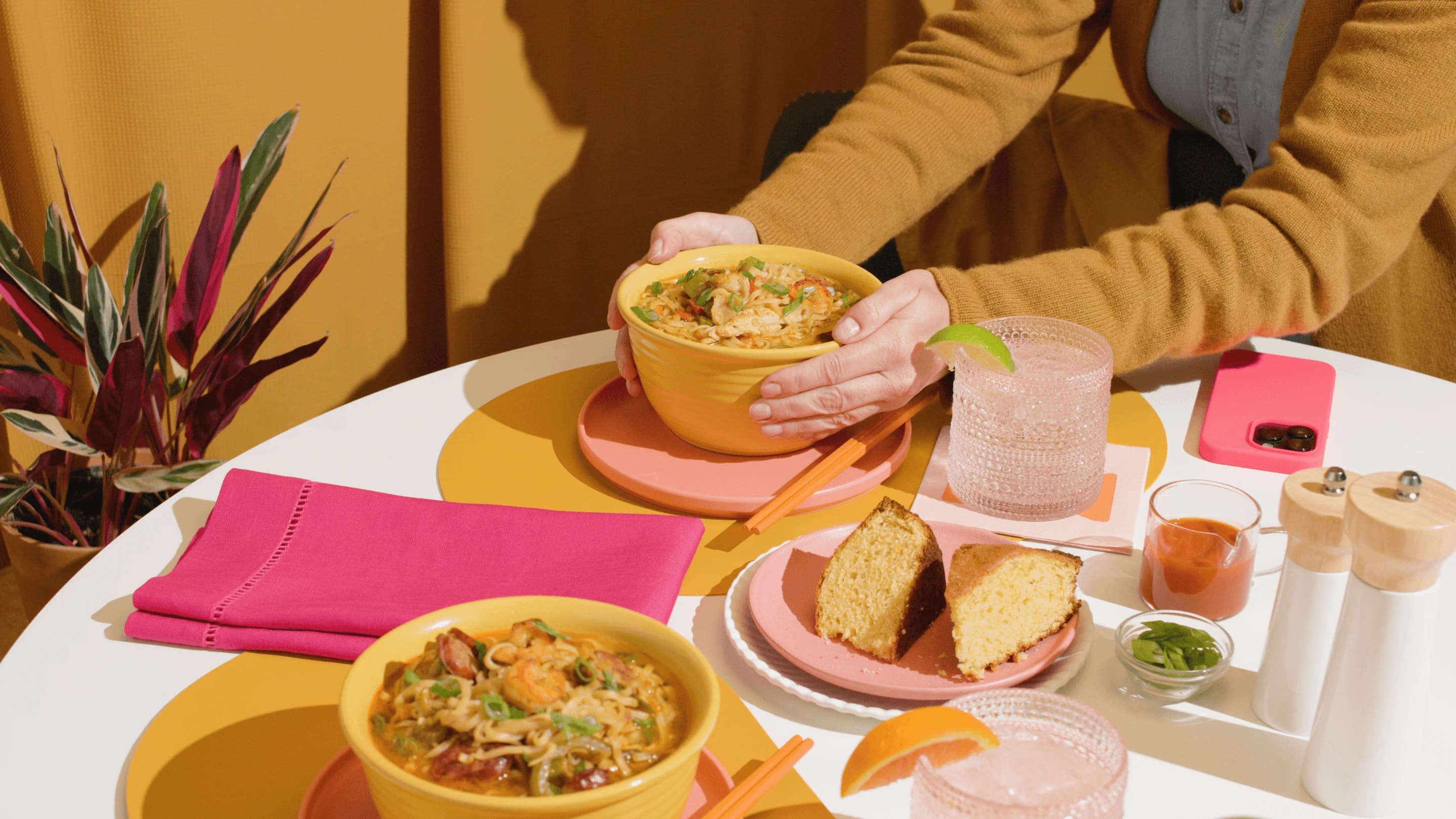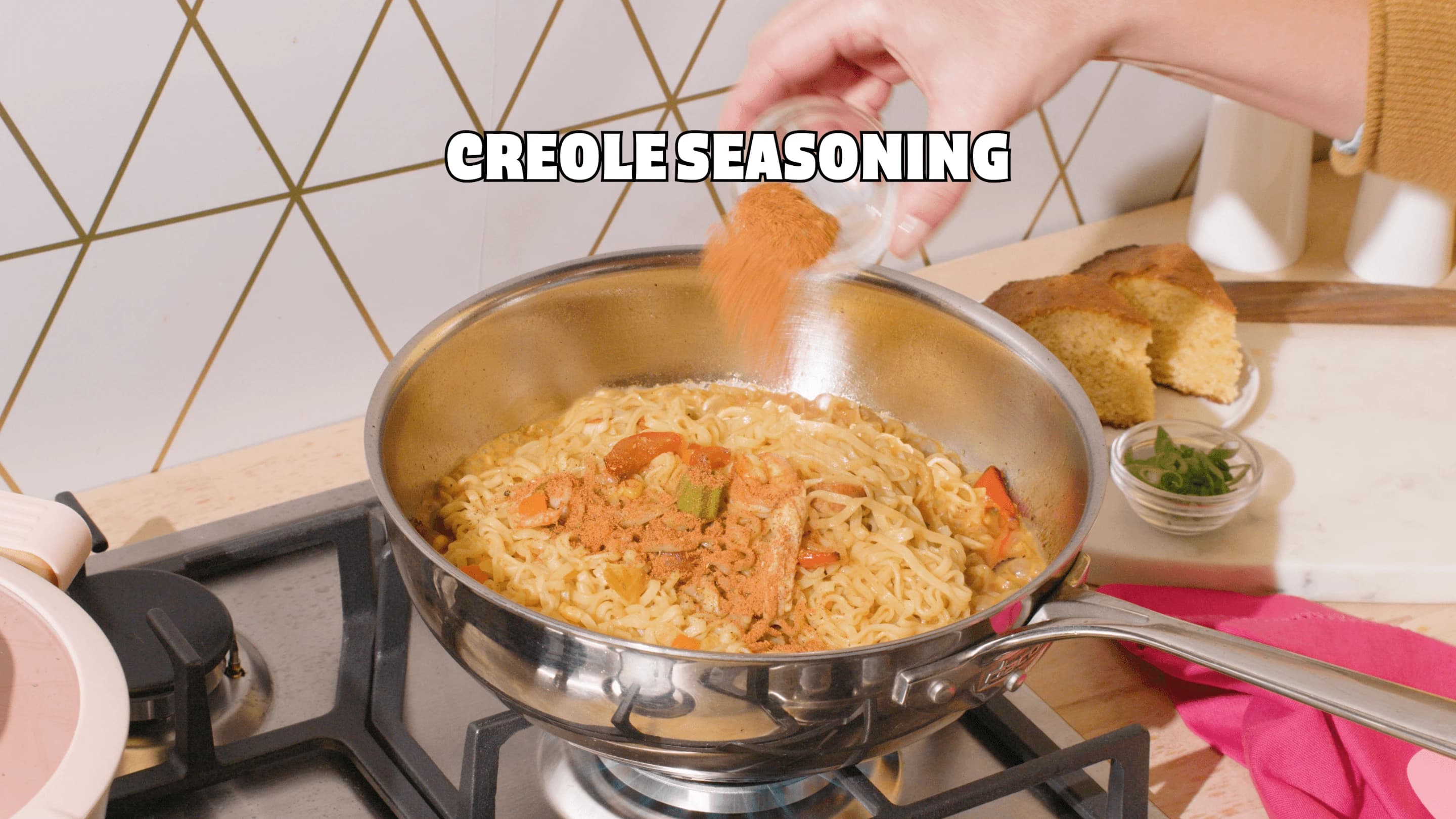 Maruchan Hot & Spicy Chicken Flavor Ramen comes alive with a hearty helping of andouille sausage, shrimp, pulled chicken, okra, onion, bell pepper and celery sautéed in butter and Creole seasoning. Finished with scallions, hot sauce to taste and served with cornbread for dipping.