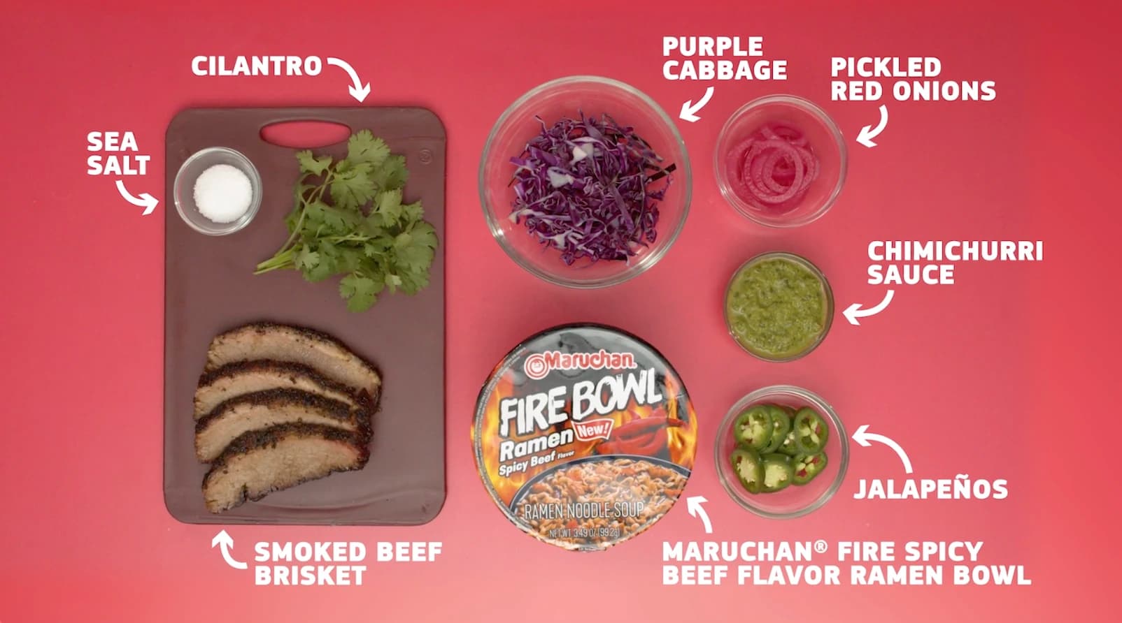Divide the seasoned noodles into bowls. Top with brisket, chimichurri, jalapeños, cabbage, pickled red onion, cilantro and sea salt. Enjoy!