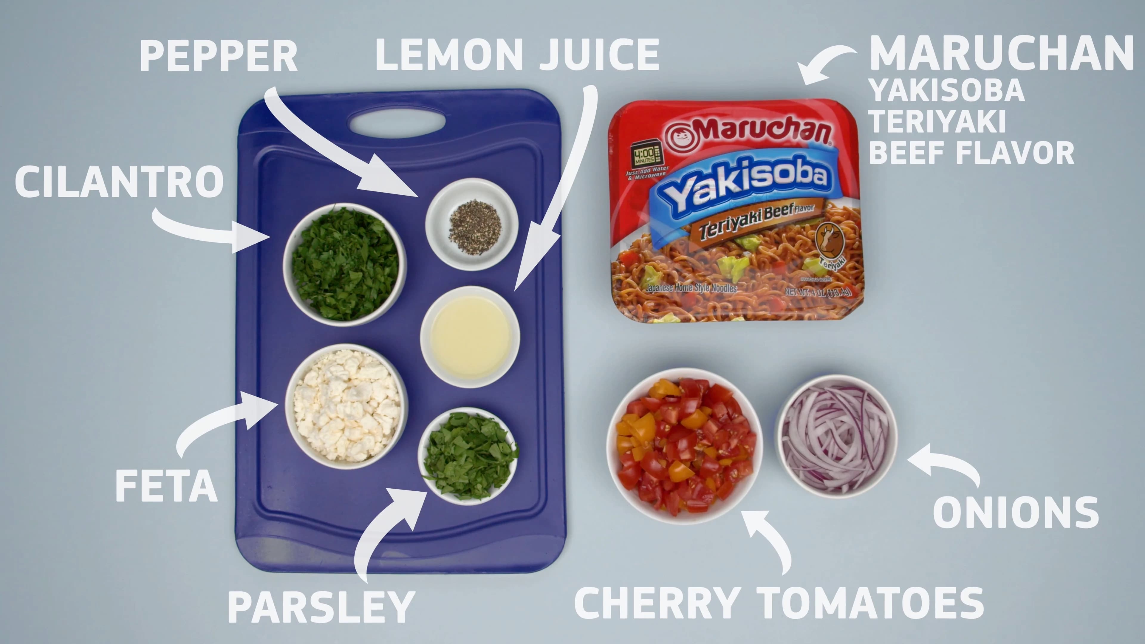 Open the lid of the Maruchan Teryaki Beef Flavor Yakisoba package halfway and remove both packets. Add packet #1 and fill water to the line indicated. Microwave covered on high for 4 minutes. Let cool for 1 minute before adding packet #2. Stir until fully combined and repeat for second package.