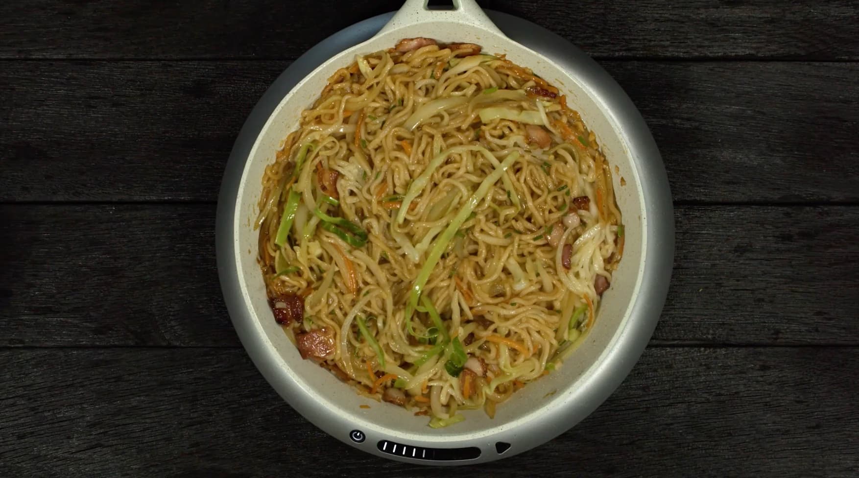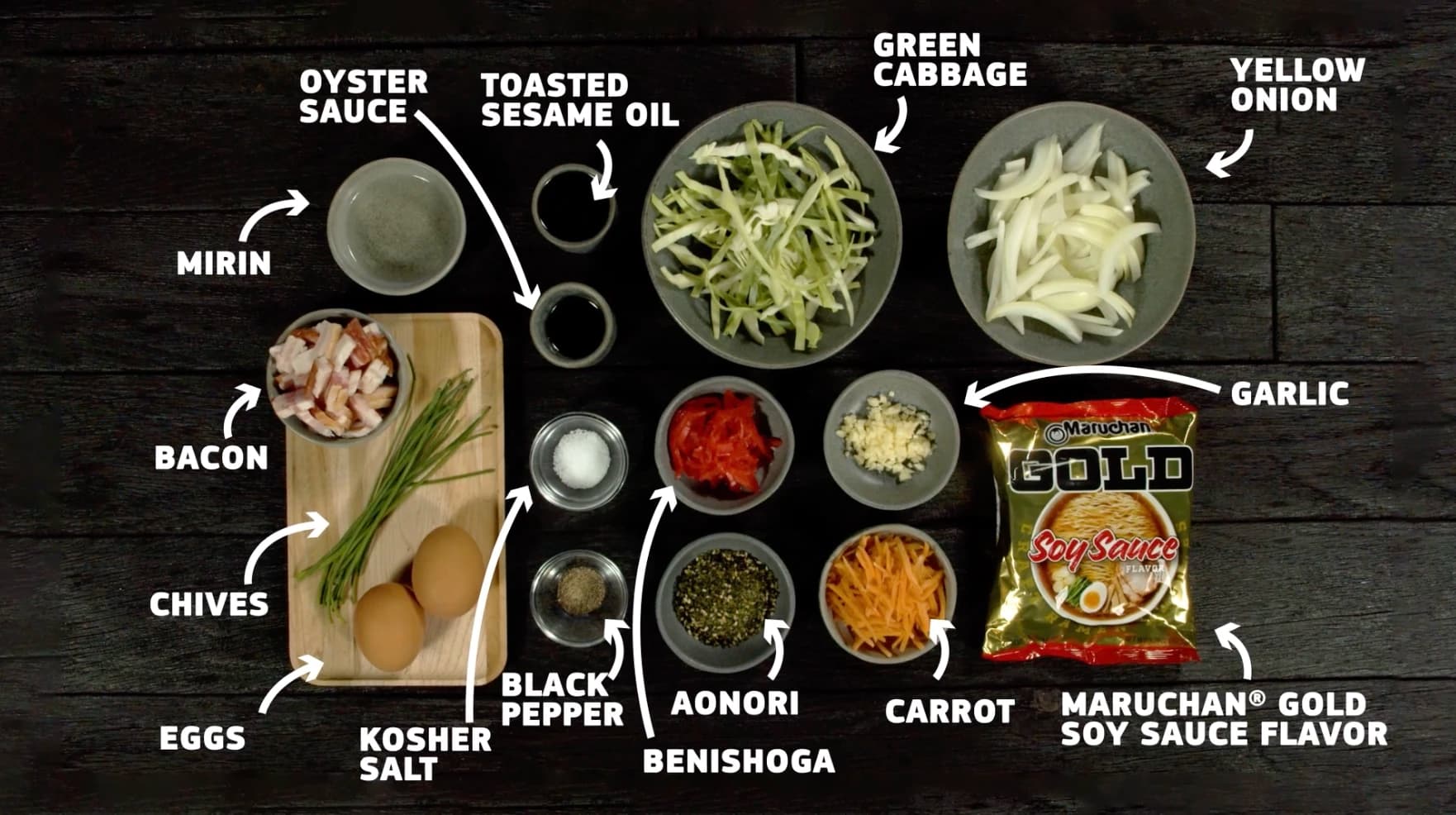 Cabbage, julienned carrots, onions and garlic add a variety of flavors and textures to this pan-fried noodle dish, while garnishes of benishoga, aonori and sunny-side-up fried eggs give it a classic finish.