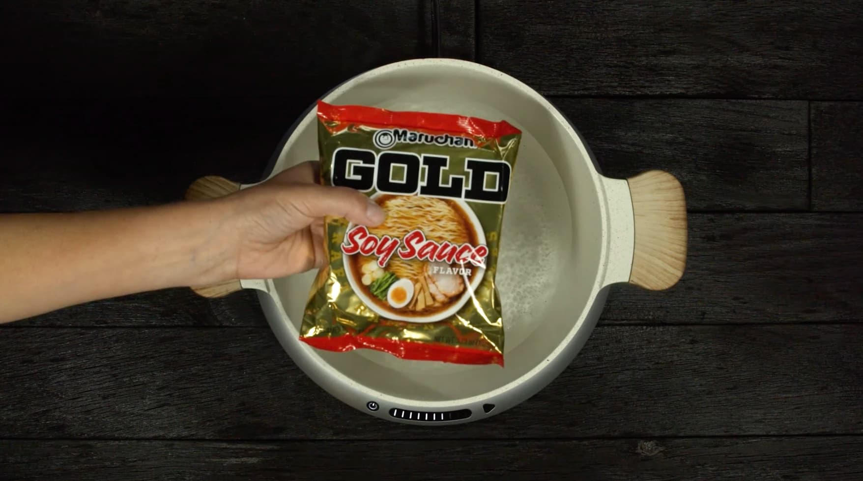 Boil 4 cups of water in a medium pot and cook 2 packages of Maruchan GOLD Soy Sauce Flavor Ramen for 3 minutes. Allow noodles to soften slightly, and then gently spread them apart. Drain and cool ramen under cold running water.