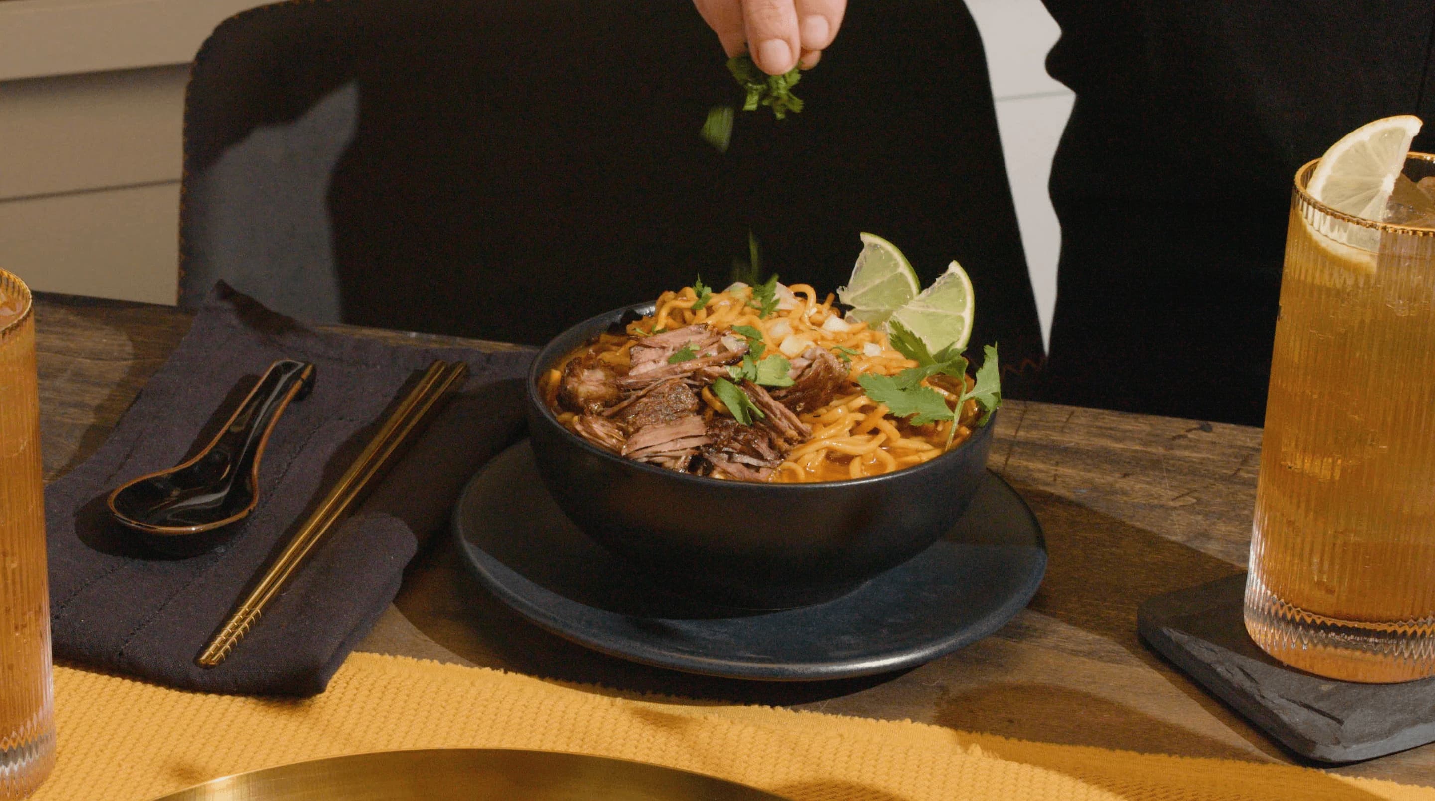 Divide noodle between 2 serving bowls. Top each bowl with 1⁄2 cup Birria Beef, 1 tbsp diced white onion, cilantro and lime. Enjoy!