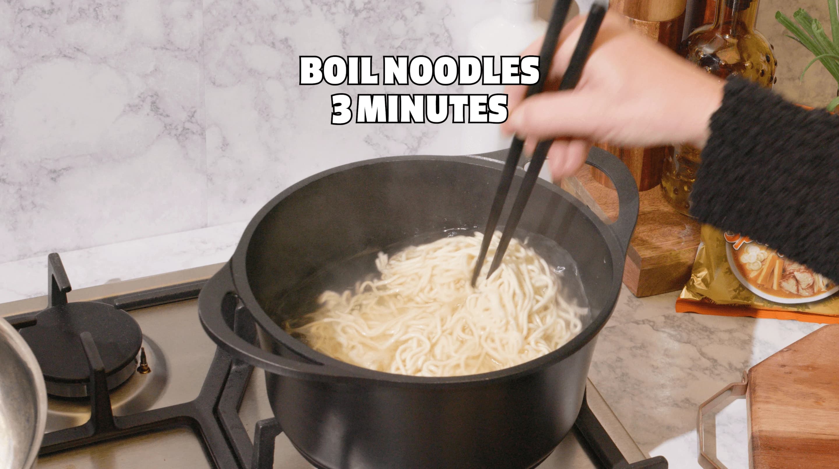 Boil 4 cups of water in medium pot and cook 2 packages of Maruchan GOLD Spicy Miso Ramen for 3 minutes. Allow noodles to soften slightly, and then gently spread them apart.