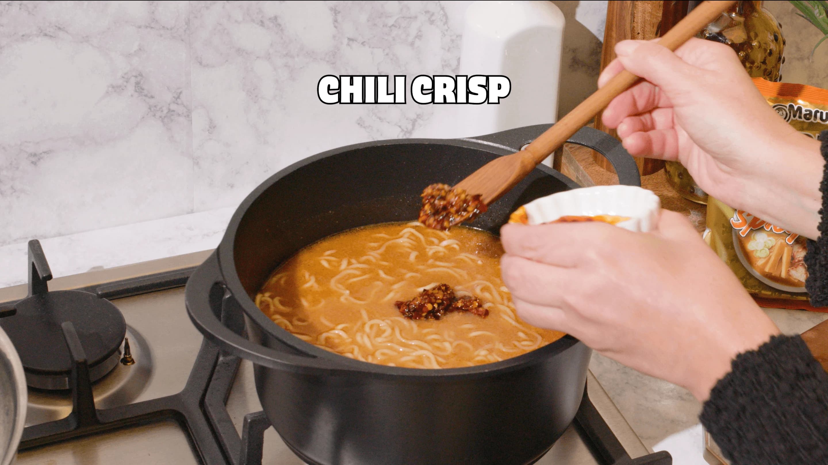 Elevate classic Maruchan GOLD Spicy Miso Flavor Ramen with the fiery zest of chili crisp and the smooth richness of peanut butter. This dish delivers a creamy and spicy experience, topped with crushed peanuts and scallions for an irresistible crunch and added flavor dimension.