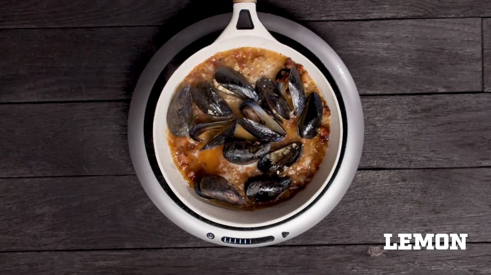 Over medium heat, render pancetta until crispy. Add mussels, white onion and garlic, cooking until fragrant and onions are soft. Deglaze pan with white wine and fresh lemon. Lower heat and reduce by half. Turn off heat, add in butter, stirring in the pan to create a sauce.