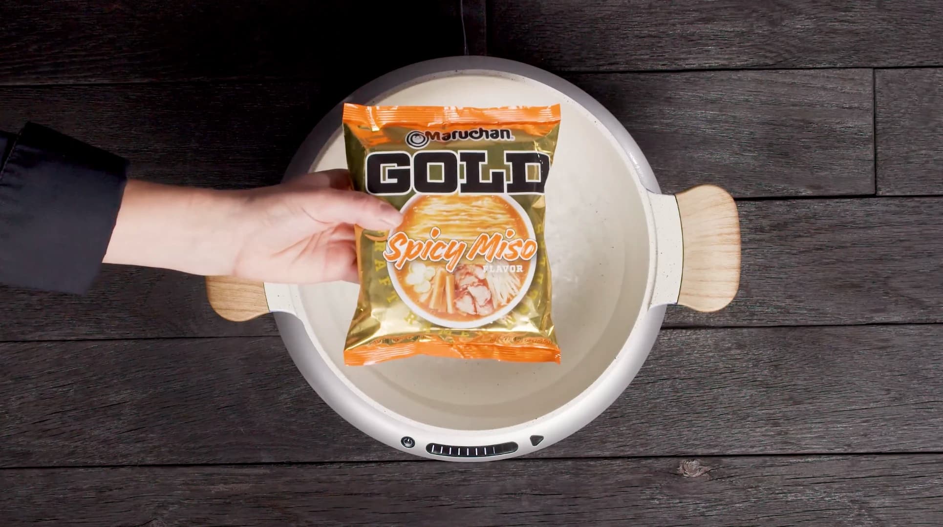 Boil 4 cups of water in a medium pot and cook 2 packages of Maruchan GOLD Spicy Miso Flavor Ramen for 3 minutes. Allow noodles to soften slightly, and then gently spread them apart.