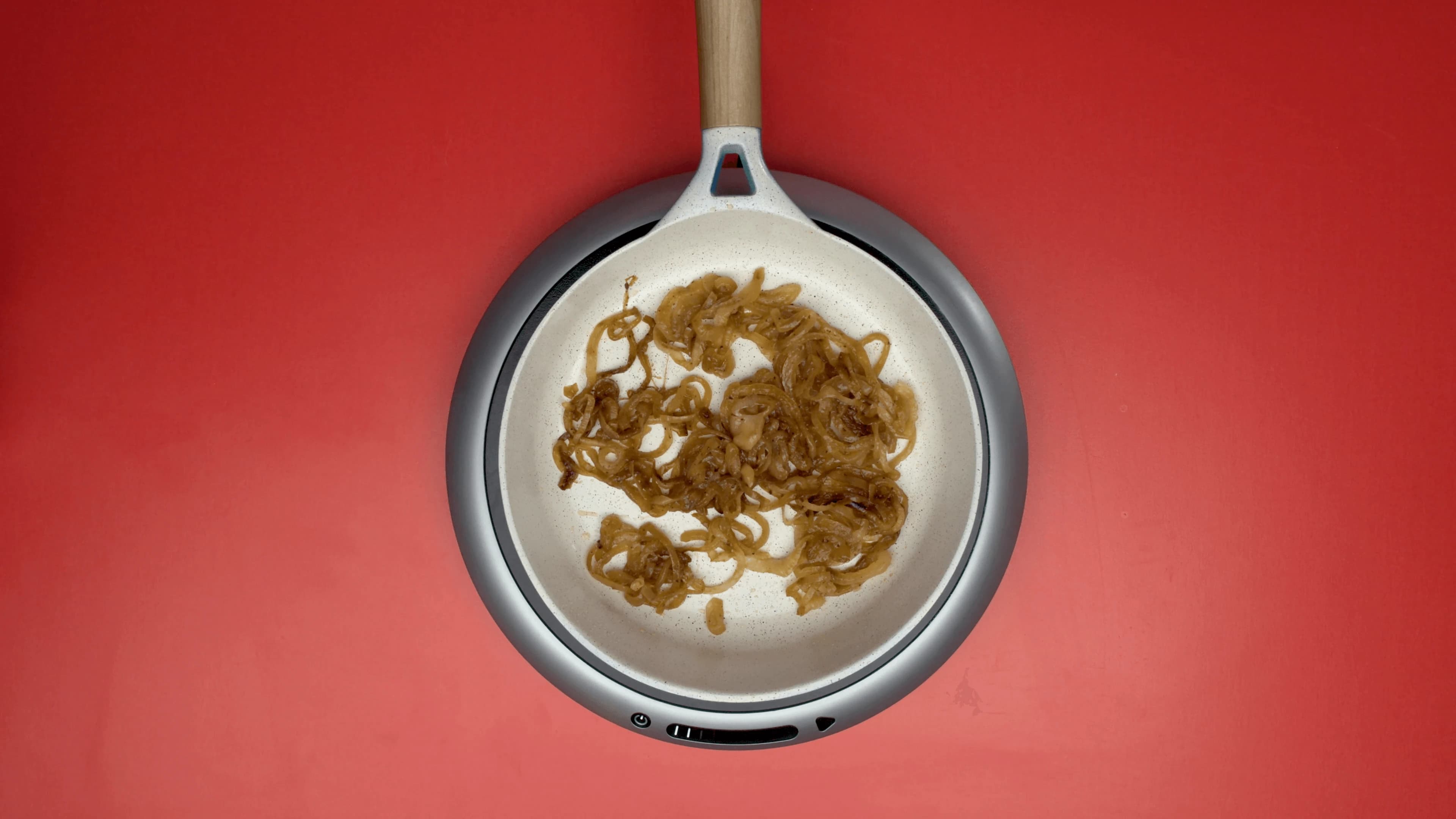 On medium-low heat, add canola oil and onions to a medium saucepan. Cook for about 30 minutes, or until soft and brown.