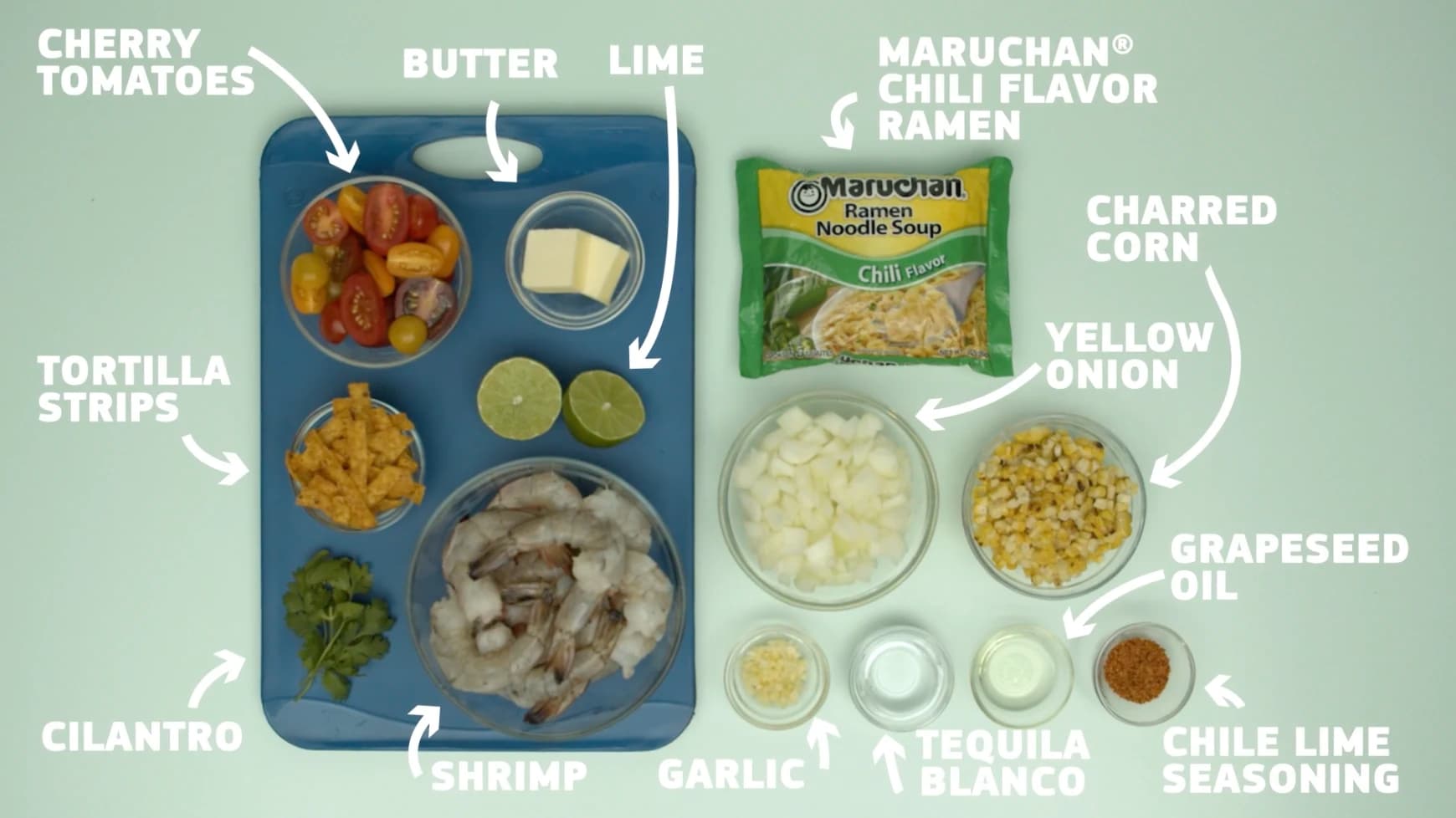 This Maruchan Chili Flavor Ramen dish brings heat from south of the border. Topped with charred corn, sweet tomatoes and fresh cilantro, this noodle bowl wouldn't be complete without the star of the show: tequila-lime shrimp.