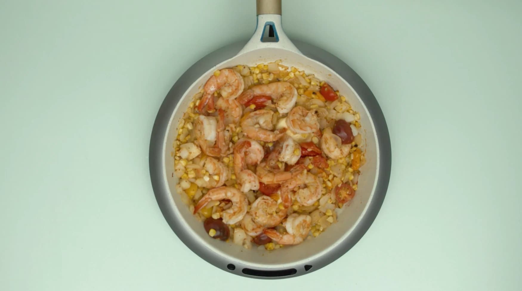 Add oil to a medium-hot pan and sauté shrimp, corn, onion, tomatoes, garlic until tender and fragrant. Season with chile-lime seasoning. Add lime juice and tequila blanco and cook the alcohol out of the pan. Turn off the heat and add unsalted butter, stirring to incorporate.