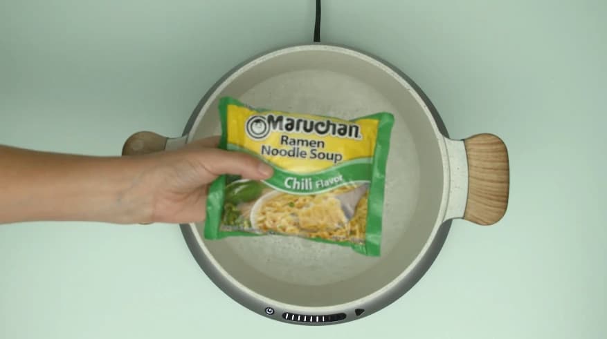 Cook Maruchan Ramen Chili Flavor Ramen in 4 cups boiling water for 3 minutes, stirring occasionally, then turn off heat. Add the contents of the seasoning packet and stir well for 1 minute until seasoning is fully dissolved.