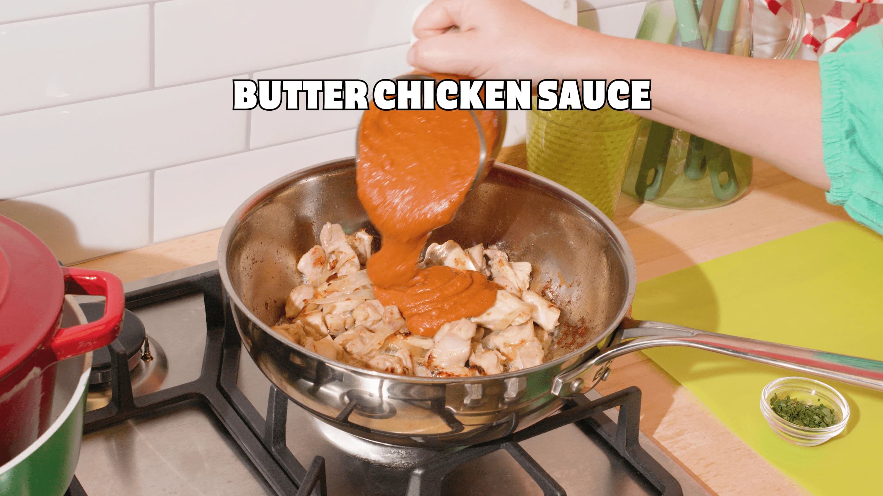 To prepare butter chicken, in a saute pan add butter, onion, chopped chicken thighs and cook until onions are translucent and chicken starts to brown. Add in prepared butter chicken sauce and simmer 15-20 minutes until chicken is fully cooked.