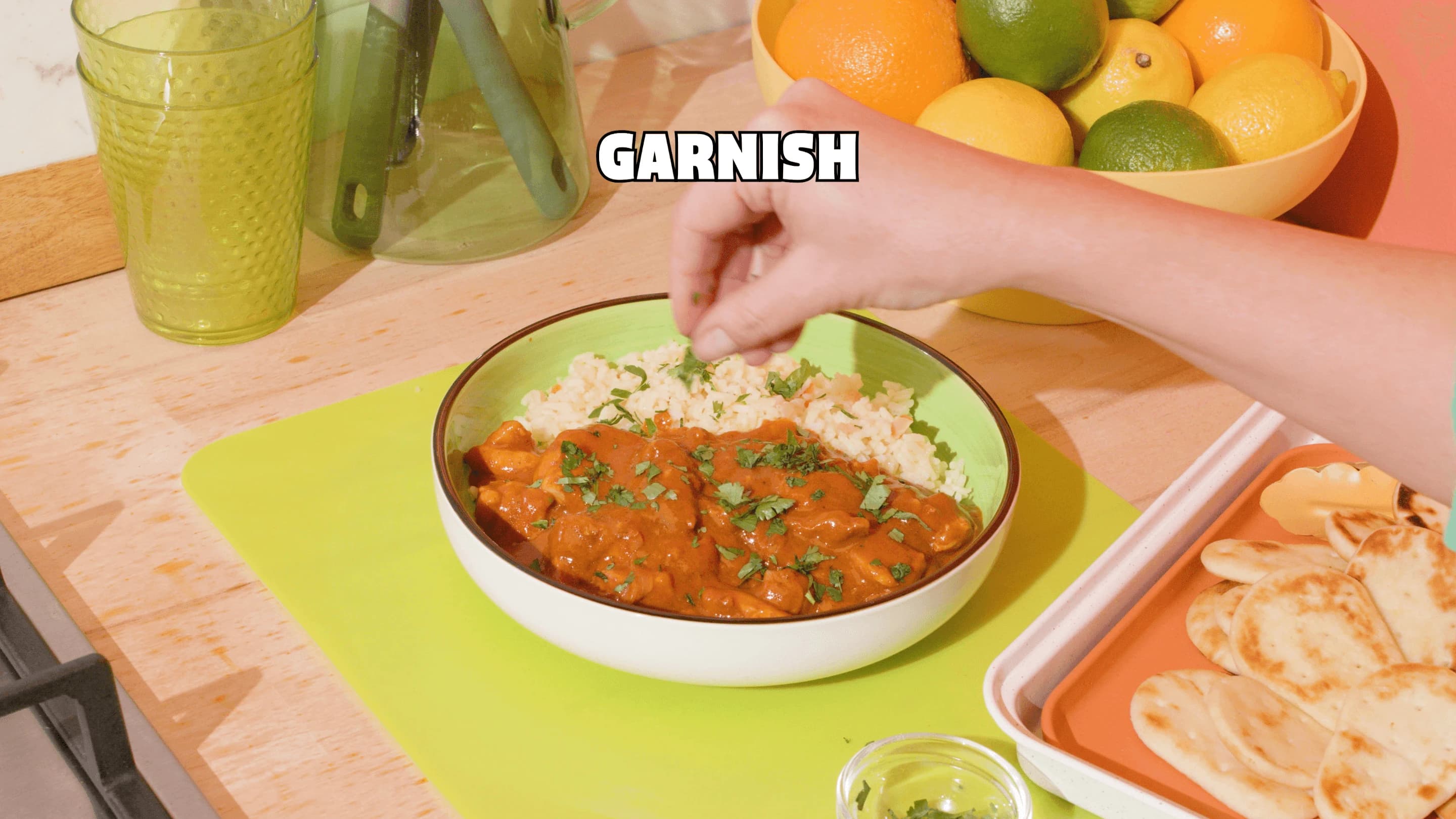 Plate two bowls of rice and divide butter chicken between. Serve with toasted mini naan bread pieces and top with cilantro. Enjoy!