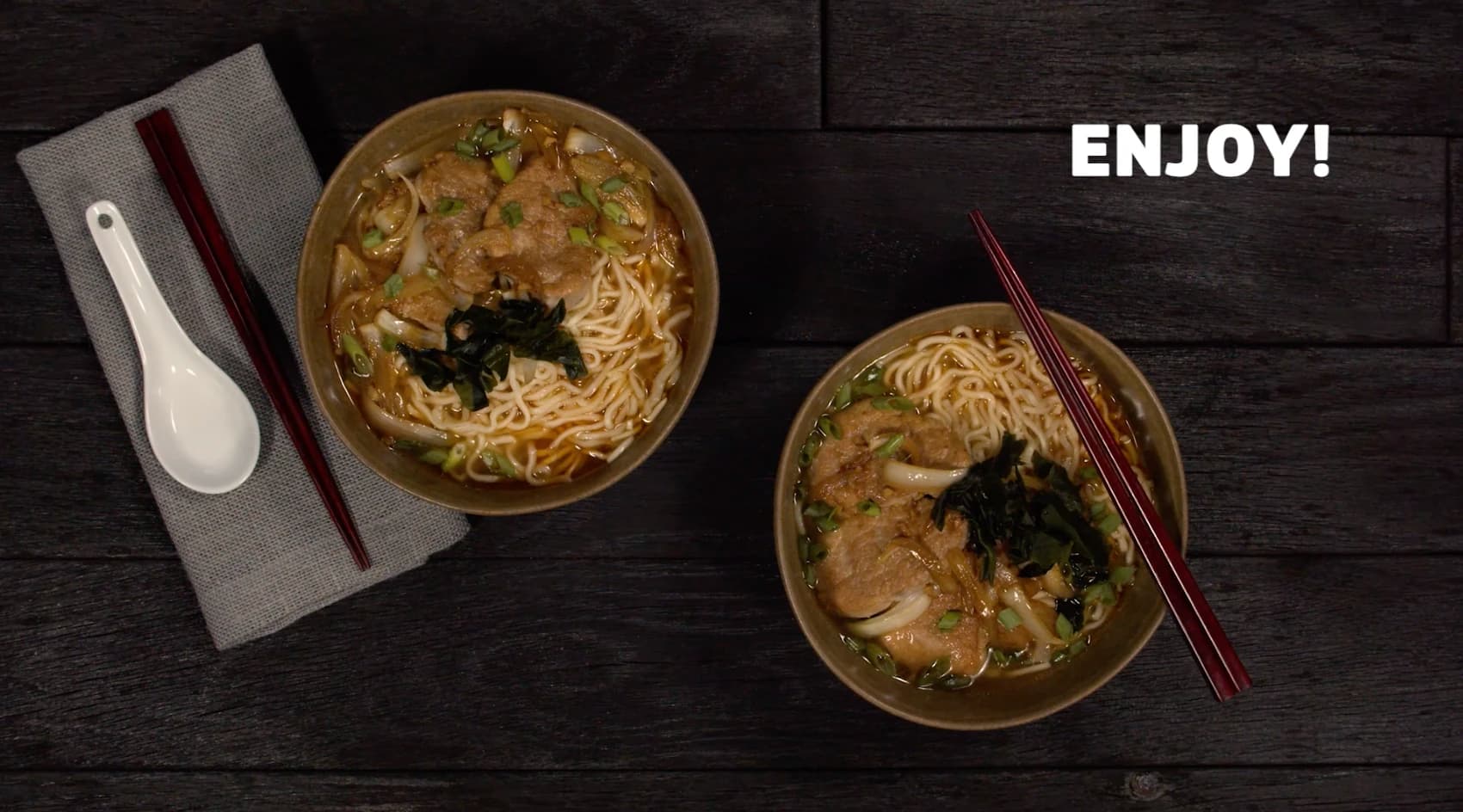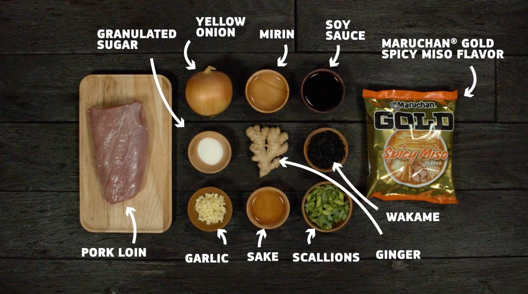 Divide ramen noodles in soup bowls, top with pork loin, onion, wakame and sliced scallions. Enjoy!