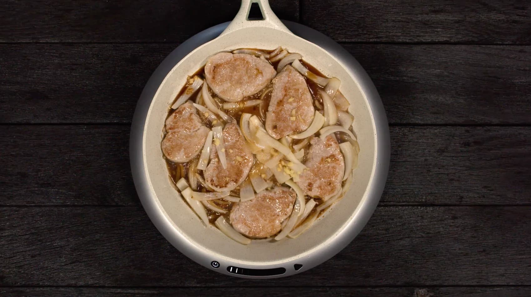 Heat a medium skillet on medium-high and add toasted sesame oil. Add pork and cook for 30 seconds on each side. Add garlic and onion, and stir-fry for 30 seconds, then add ginger and mix. Lower the heat and add soy sauce, mirin, sake and sugar and briefly stir-fry, allowing the sauce to blend with meat.