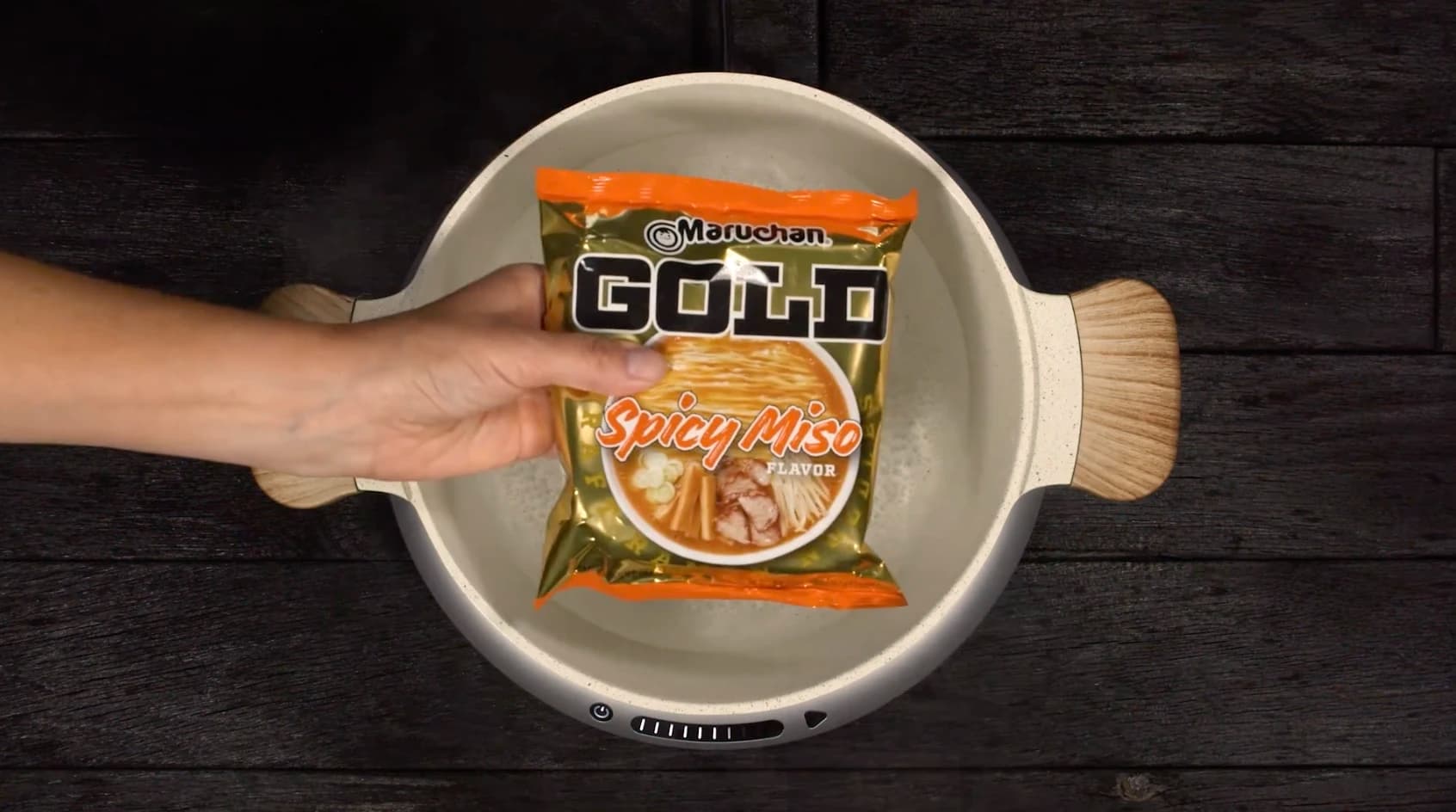 Boil 4 cups of water in a medium pot and cook 2 packages of Maruchan GOLD Soy Sauce Flavor Ramen for 3 minutes. Allow noodles to soften slightly, and then gently spread them apart.