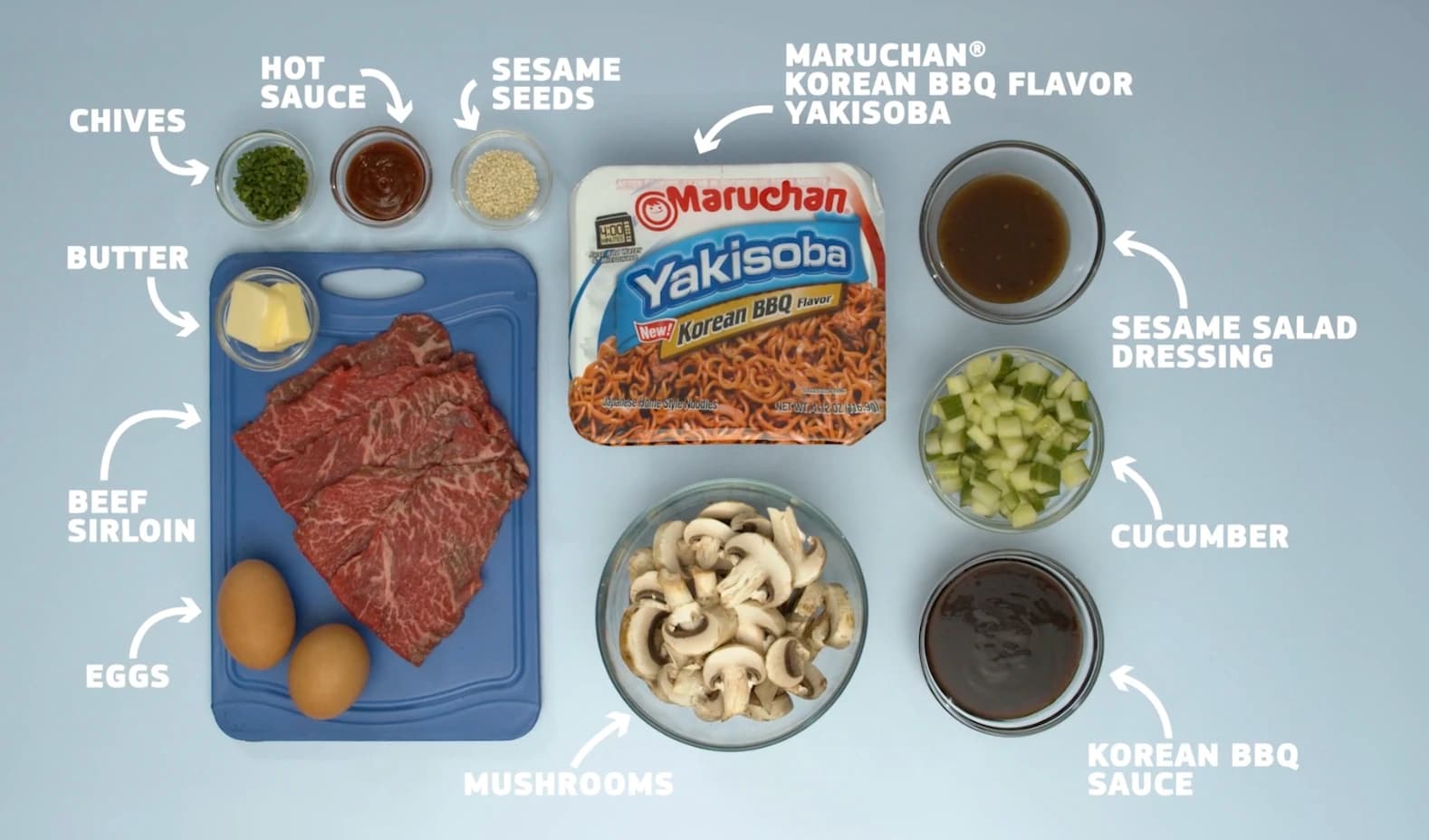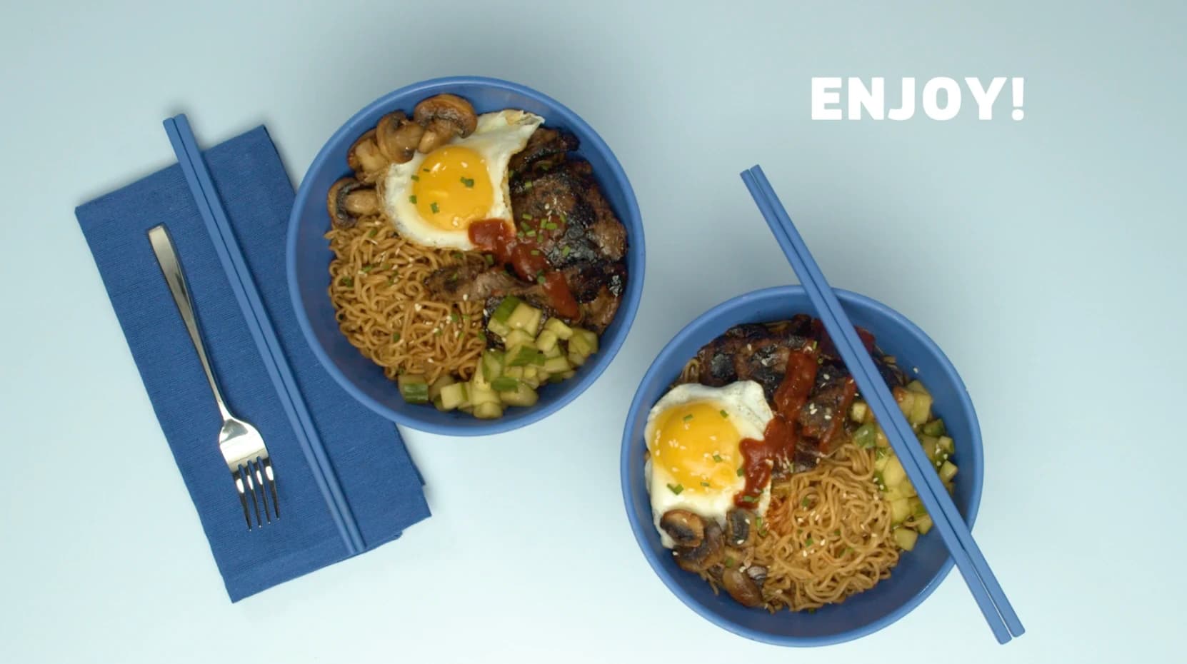 Divide the seasoned noodles into bowls. Top with grilled beef sirloin, marinated cucumbers, fried egg and sautéed mushrooms, then garnish with hot sauce, chives and sesame seeds. Enjoy!