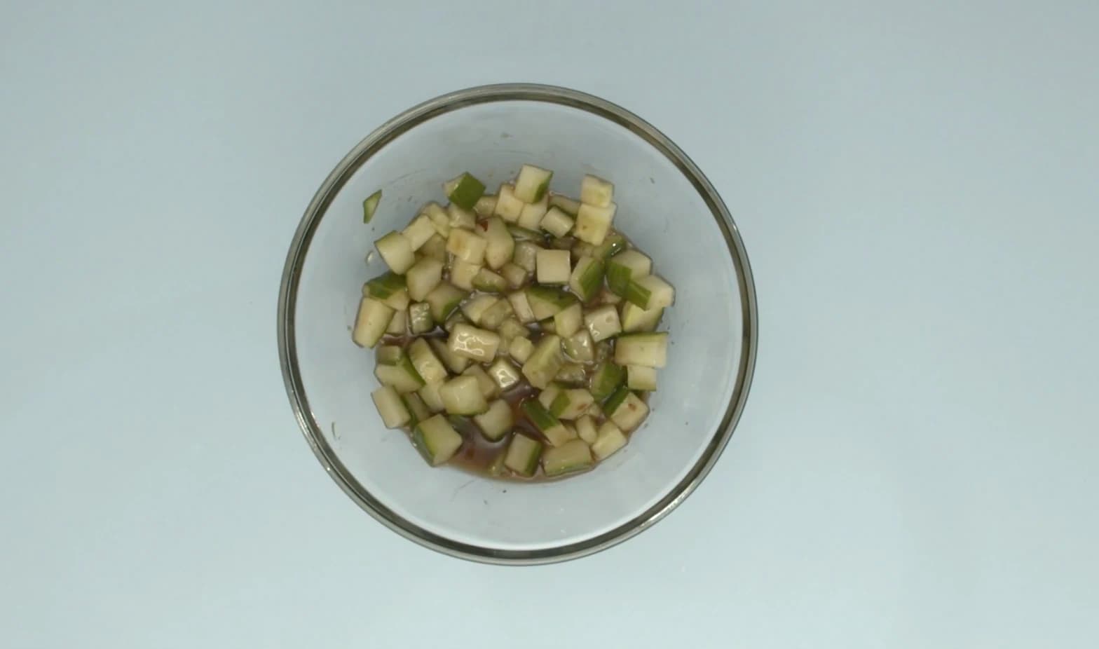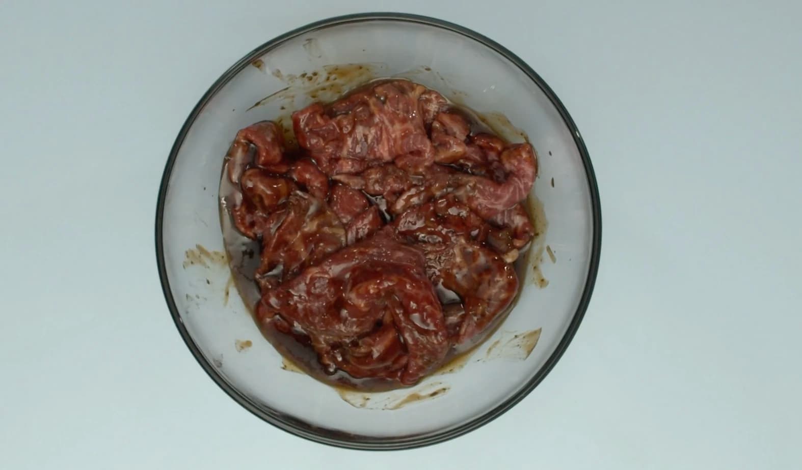 Marinate beef sirloin in Korean BBQ sauce for 10 minutes, then grill. Separately, marinate cucumbers in sesame salad dressing for 10 minutes.