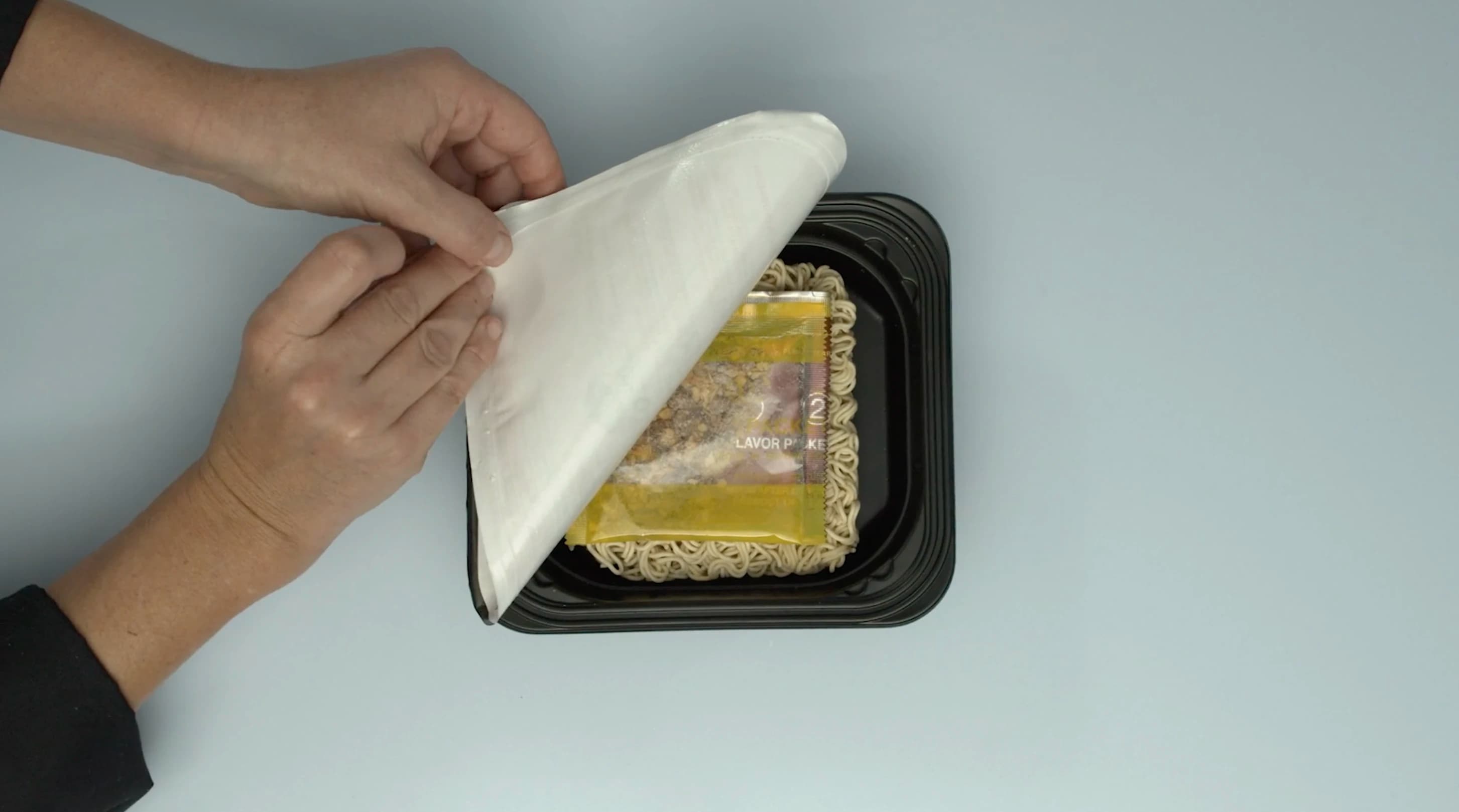 Open the lid of the Maruchan Korean BBQ Flavor Yakisoba package halfway and remove both packets. Add packet #1 and fill water to the line indicated. Microwave covered on high for 4 minutes. Let cool for 1 minute before adding packet #2. Stir until fully combined and repeat for second package.