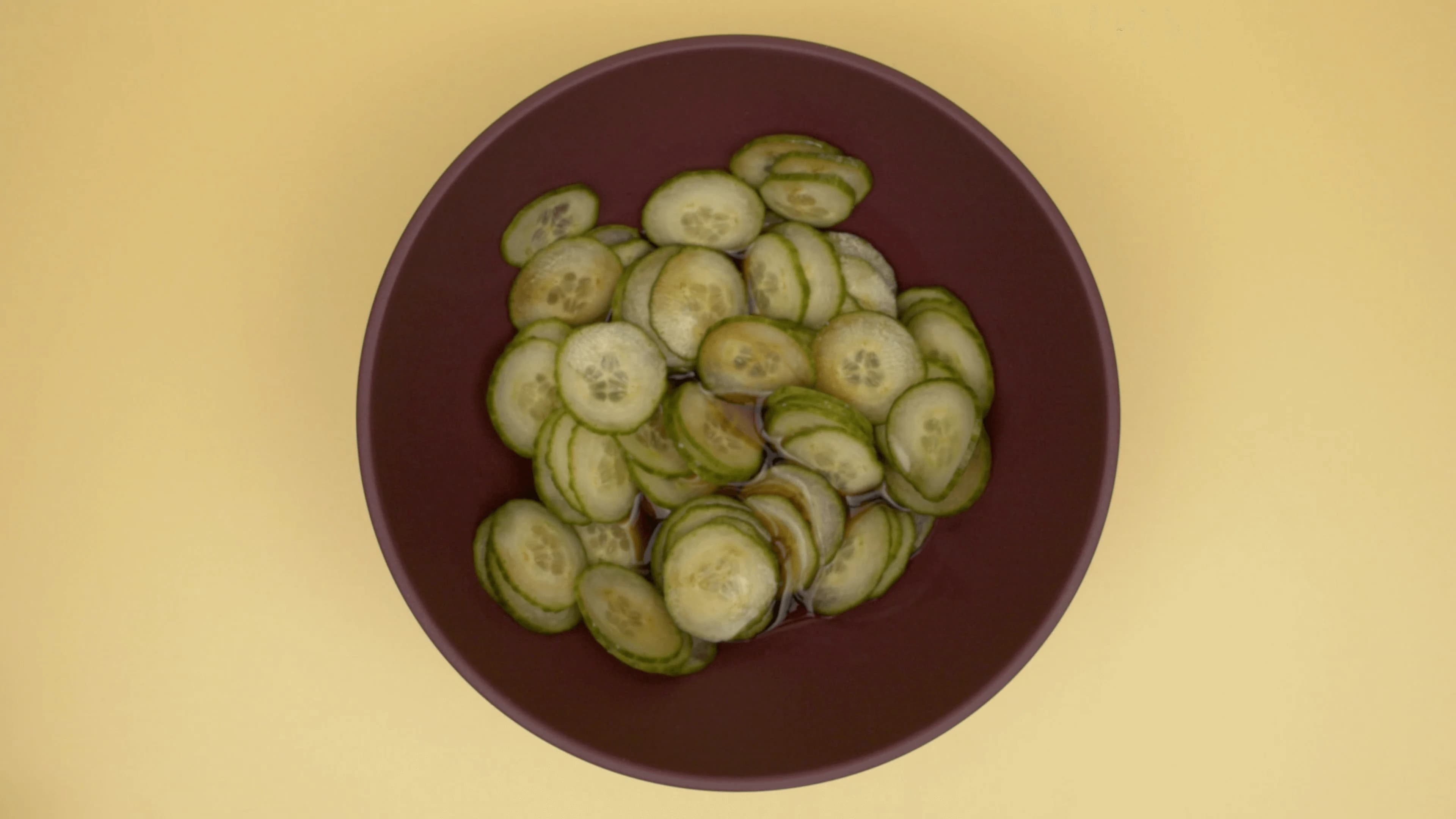 Add thinly sliced cucumber to a bowl with rice vinegar, water, soy sauce and honey. Toss until completely coated and let marinate in the refrigerator for at least 1 hour.
