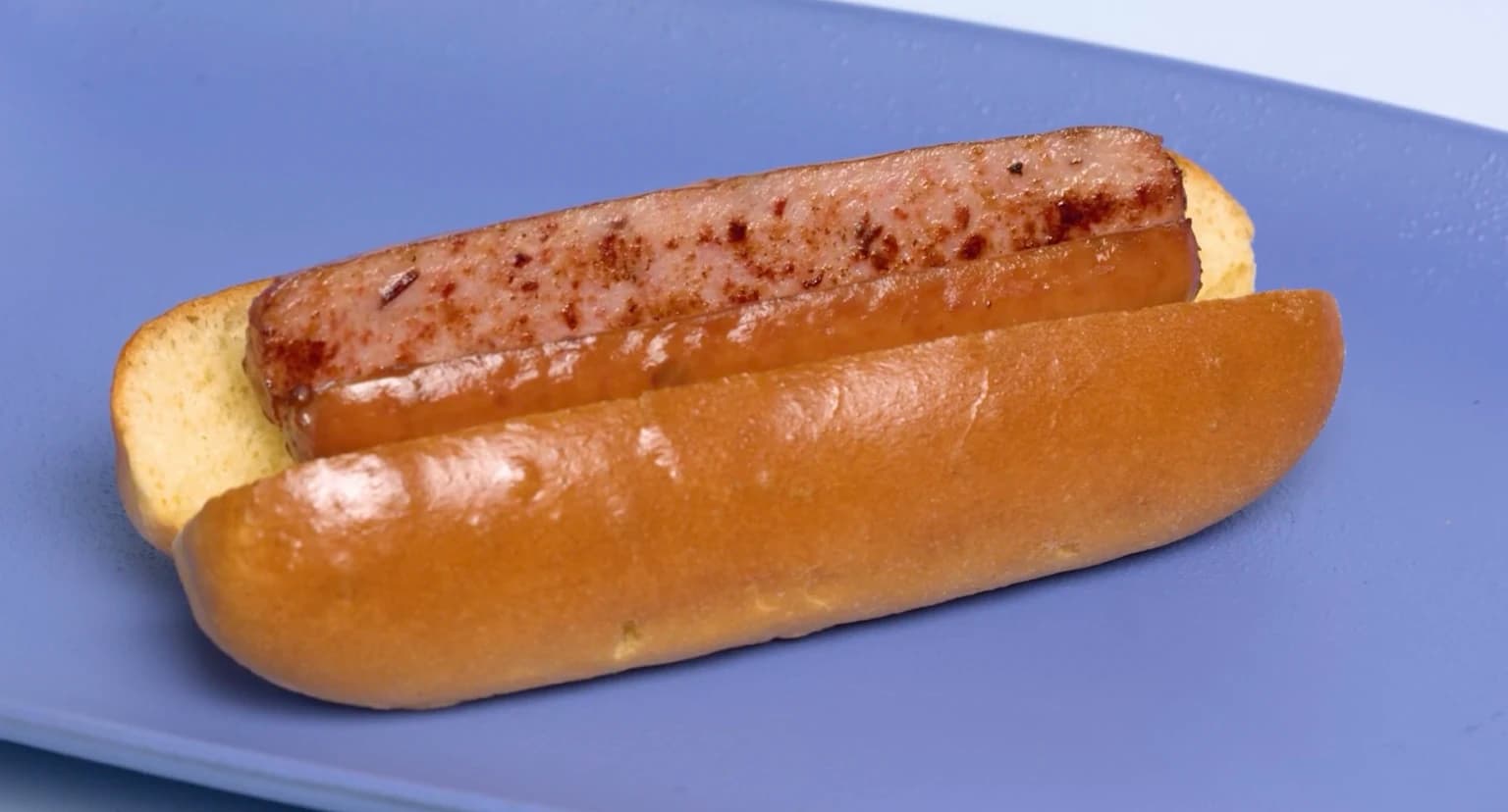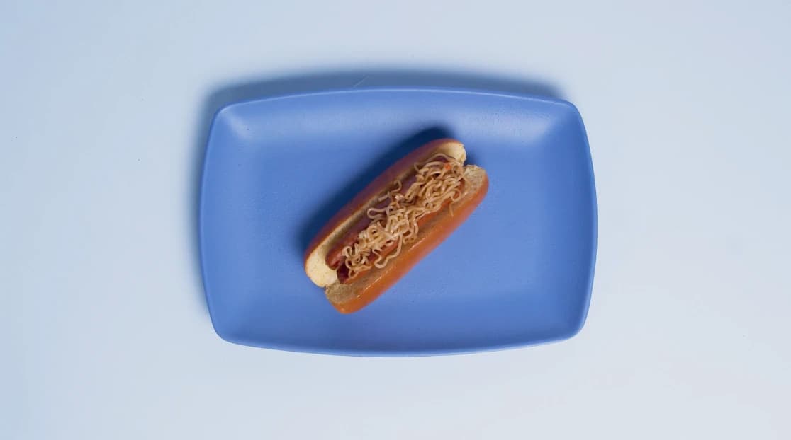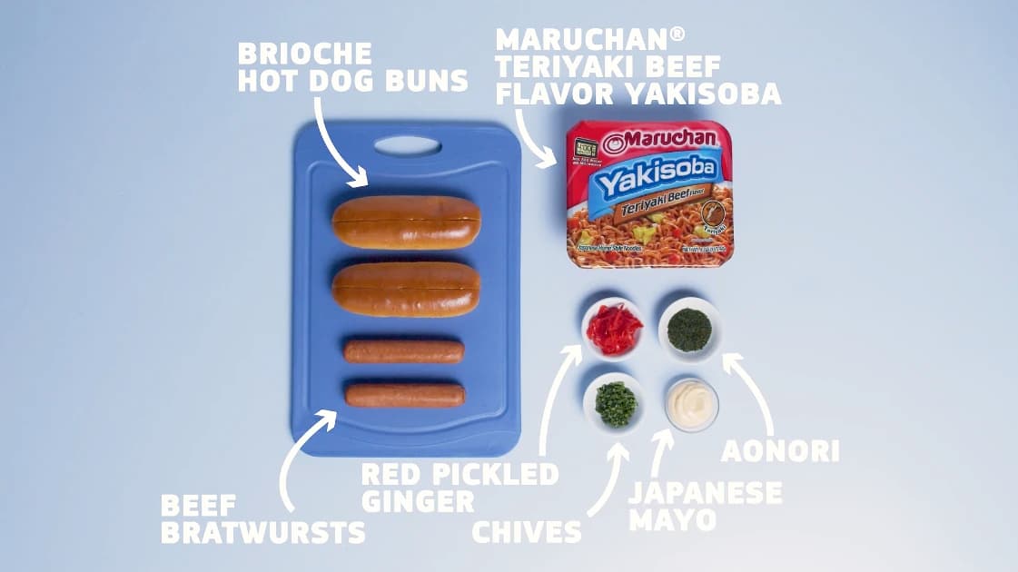 A smoked beef brat in a split-top brioche bun is topped with Maruchan Teriyaki Beef Flavor Yakisoba, Japanese mayo, red pickled ginger and aonori flakes for a delicious dog you can enjoy on the go.
