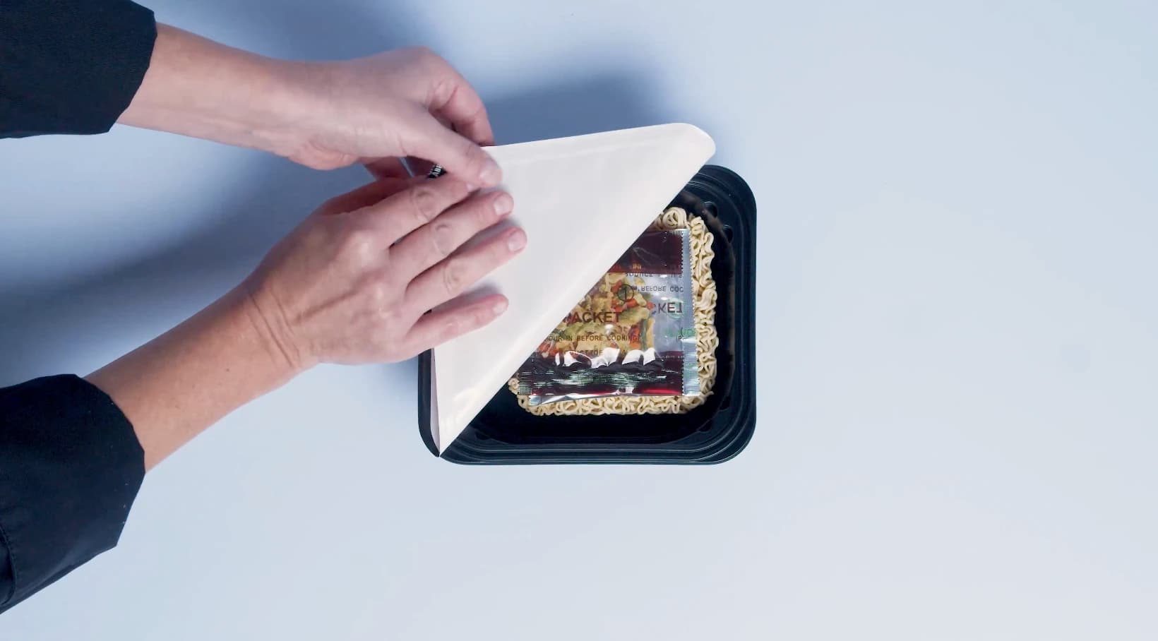 Open the lid of the Maruchan Teriyaki Beef Flavor Yakisoba package halfway and remove both packets. Add packet #1 and fill water to the line indicated. Microwave covered on high for 4 minutes. Let cool for 1 minute before adding packet #2. Stir until fully combined.