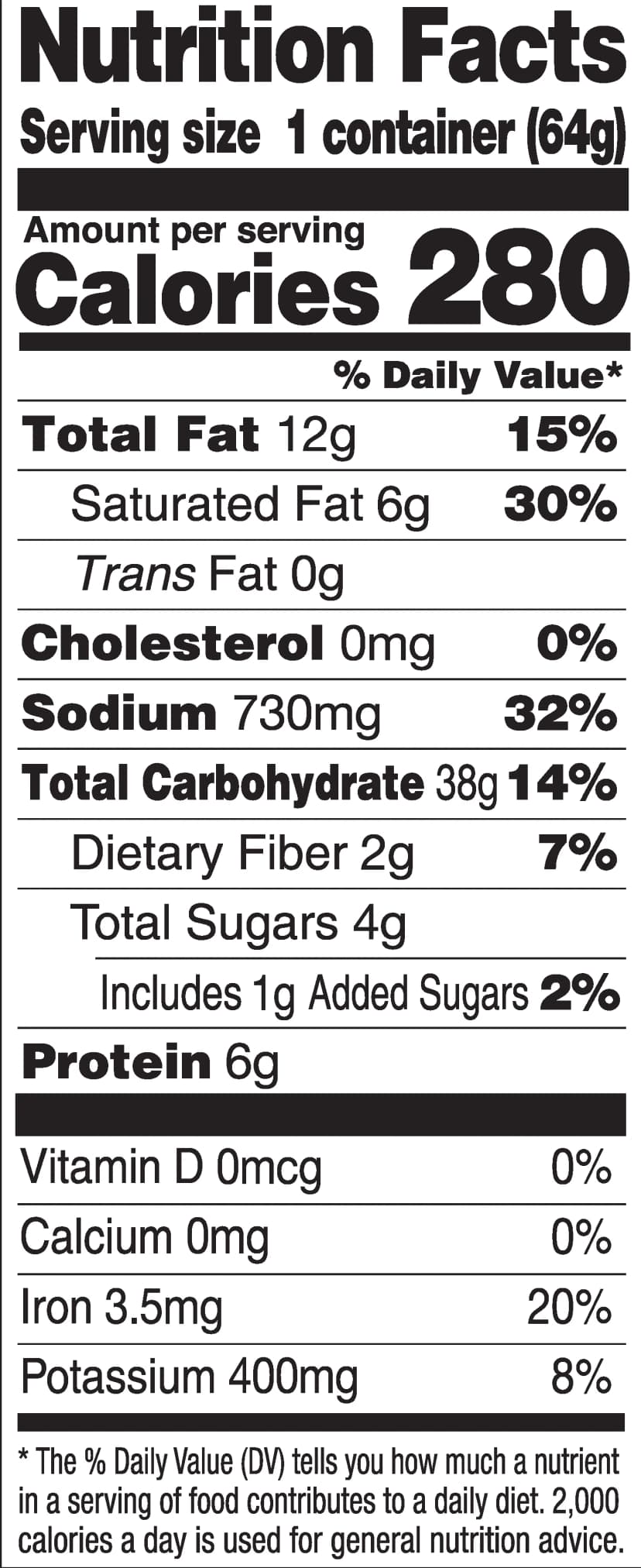 INGREDIENTS: ENRICHED WHEAT FLOUR (WHEAT FLOUR, NIACIN, REDUCED IRON, THIAMINE MONONITRATE, RIBOFLAVIN, FOLIC ACID), VEGETABLE OIL (CONTAINS ONE OR MORE OF THE FOLLOWING: CANOLA, COTTONSEED, PALM) PRESERVED BY TBHQ, DEHYDRATED VEGETABLES (CARROT, CORN, GREEN PEAS, ONION, GARLIC, CELERY STALK, CHIVE), SALT, SUGAR, CONTAINS LESS THAN 2% OF: POTASSIUM CHLORIDE, YEAST EXTRACT, MALTODEXTRIN, POWDERED COOKED CHICKEN, NATURAL FLAVORS, CHICKEN FAT, SPICES (CELERY SEED), DEHYDRATED SOY SAUCE (WHEAT, SOYBEANS, SALT), DISODIUM GUANYLATE, DISODIUM INOSINATE, POTASSIUM CARBONATE, HYDROLYZED CORN PROTEIN, HYDROLYZED WHEAT PROTEIN, HYDROLYZED SOY PROTEIN, SODIUM CARBONATE, TURMERIC, SODIUM HEXAMETAPHOSPHATE, SODIUM TRIPOLYPHOSPHATE, MONOSODIUM PHOSPHATE, LACTOSE, SILICON DIOXIDE (ANTI-CAKING AGENT).